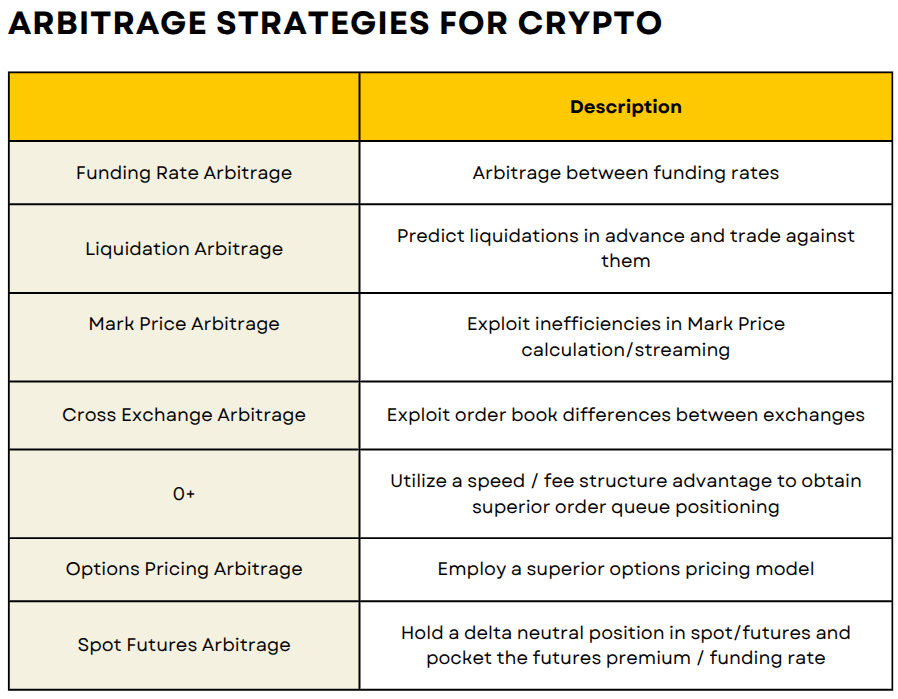 Bonus: Arbitrage between funding rates on perp options. The perp option box spread is an example of this. Funding rates on perp options are generally much higher than on perp futures (many perp options have funding rates as high as 10% per hour).