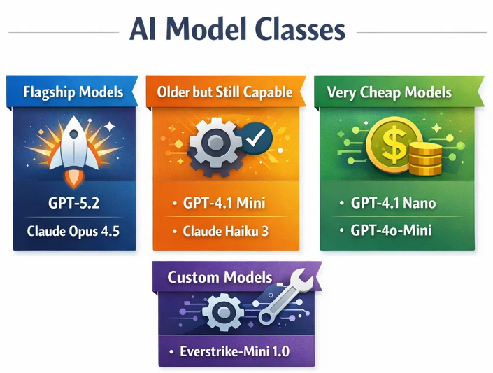 - Flagship models (GPT 5.2, Claude Opus 4.5, Gemini 3 Pro) - these are expensive, and are typically used for low-frequency high-impact prompts