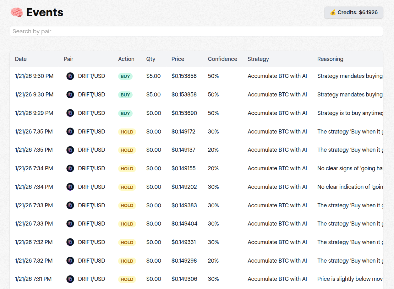 Understanding the reasoning that your agent employs is especially useful for high-impact decisions that lead to trading. Most vibetrading platforms allow you to search through the decisions made by your agent, sort them by confidence and impact, and examine the reasoning behind each. This is crucial for refining your prompt over time and improving the performance of your agent.