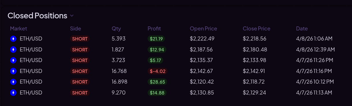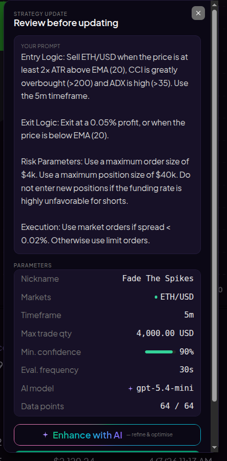 We ran a "fade the spikes" mean reversion scalping strategy on the Everstrike Testnet. It utilized the 5m timeframe on the ETH/USD market. It ran for a total of 24 hours and opened a total of 6 short positions. It accumulated a total profit of 0.4%, with a winrate of 83% and a win/loss ratio of 4.12. It utilized the GPT-5.4 Mini model, made a total of 2,880 evaluations and incurred $5.5 in evaluation costs.