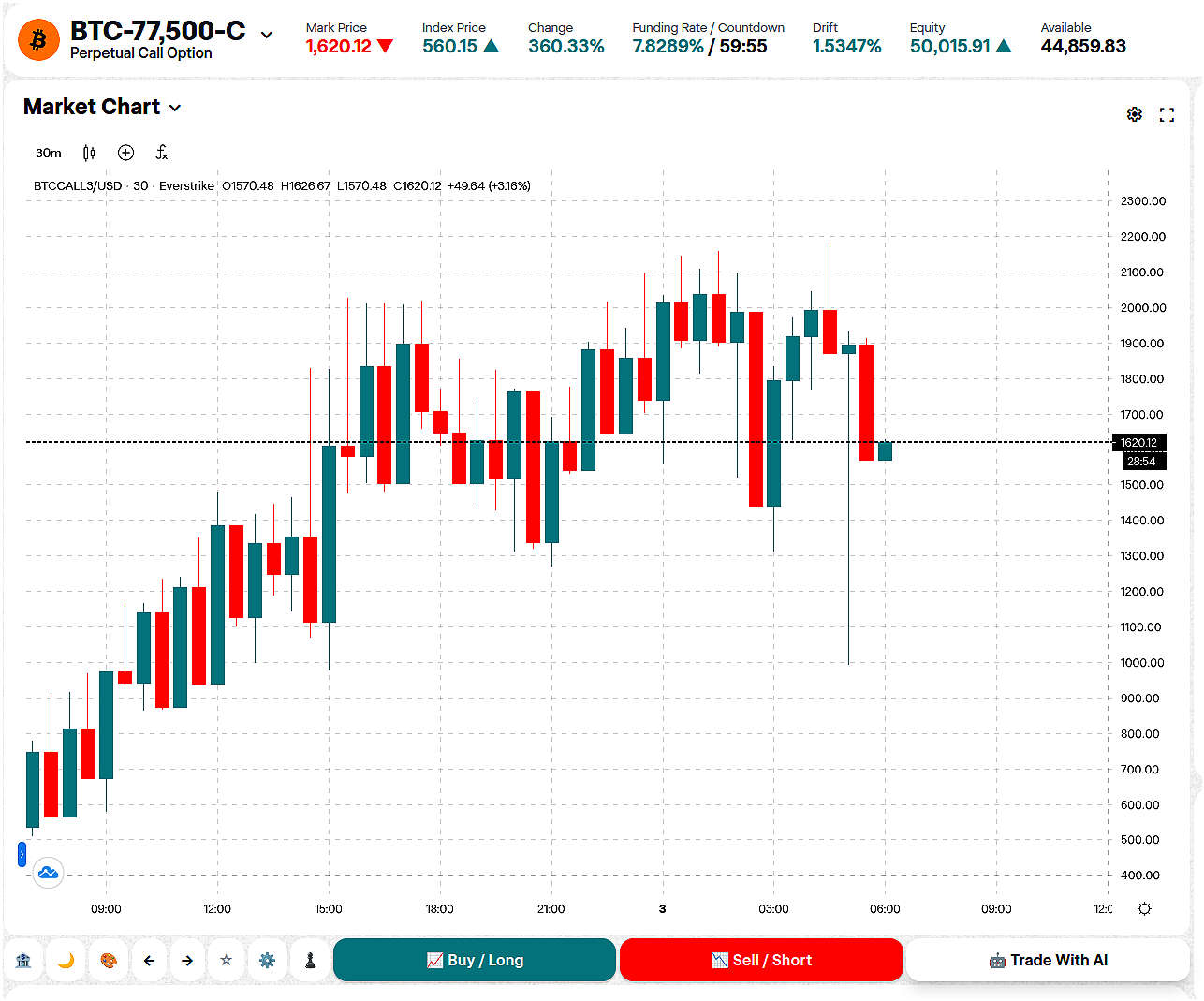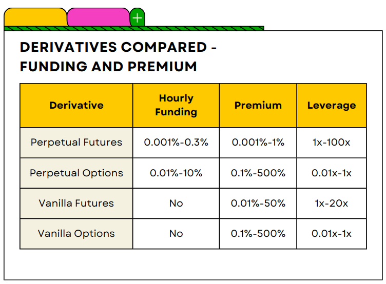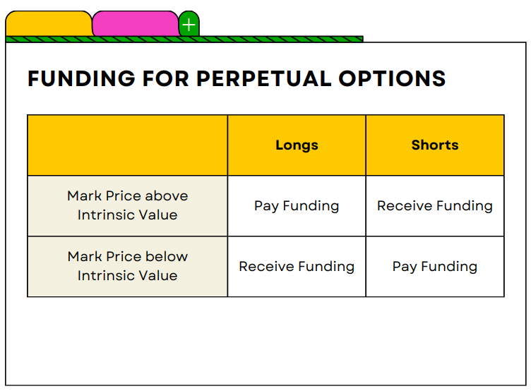 The perpetual option includes a funding rate that the seller of the option earns. The funding rate on an at-the-money perpetual option can be as large as 10% per hour on some strikes, allowing the seller to recoup 240% of their position size in less than 24 hours.